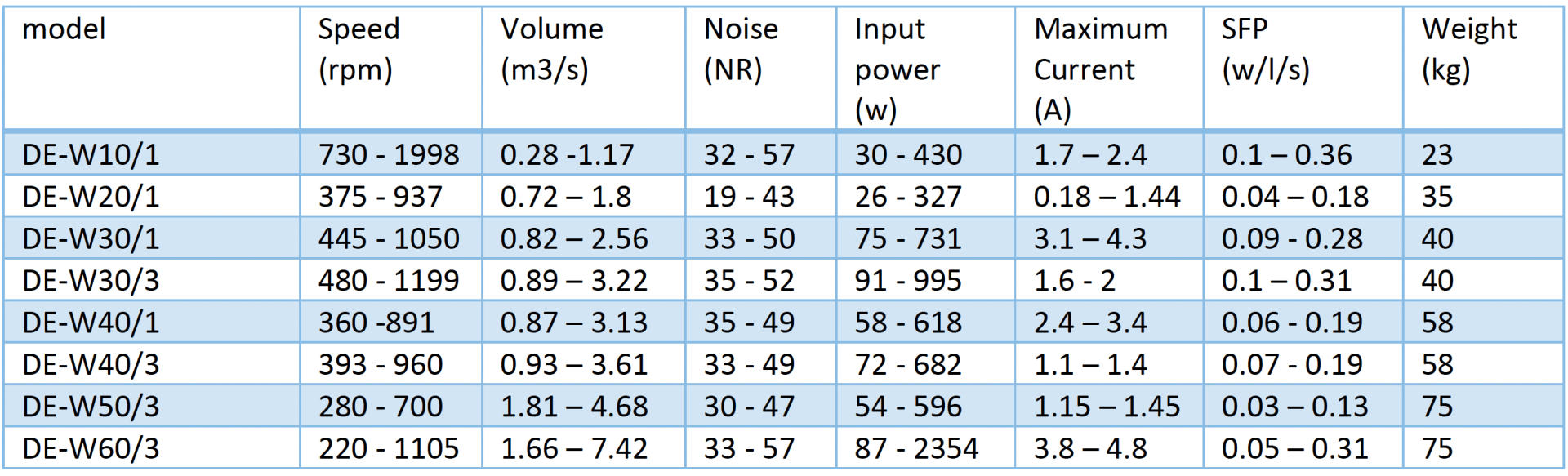 NOTE : /1 denotes single phase EC motor and /3 denotes three phase EC motor. Models W10 and W20 are only available with single phase EC motors and models W50 and W60 are only available with three phase EC motors.